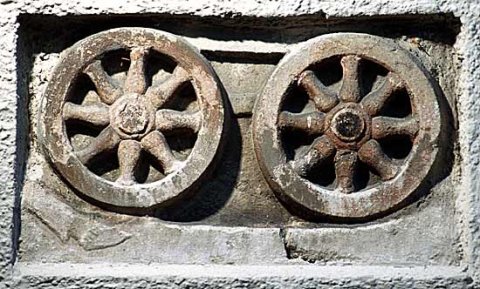 - Wagenszene: Räder eines vierrädrigen Wagens. Das Bein eines Huftiers (Ziege ?), das links unter dem Rad zu sehen ist, gehört zu einem anderen Relieffragment ?