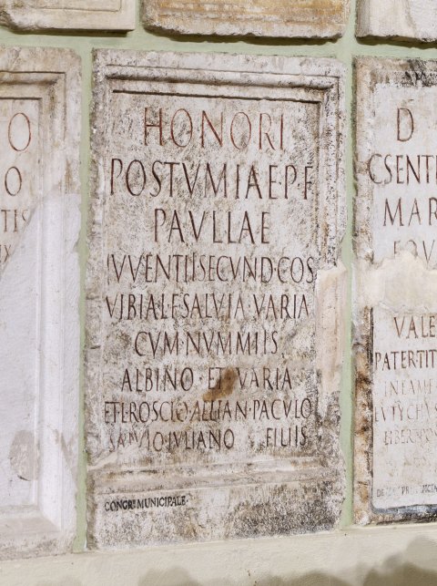 - Honori / Postumiae P(ubli) f(iliae) / Paullae / Iuventii Secund(i) co(n)s(ulis) / Vibia L(uci) f(ilia) Salvia Varia / cum Nummiis / Albino et Varia / et L(ucio) Rosci[o A]elian(o) Pasculo / Salvio Iuliano filiis