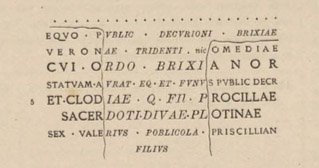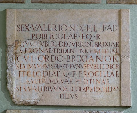- CIL: Sex(to) Valerio Sex(ti) fil(io) Fab(ia) / Poblicolae eq(uiti) R(omano) / equo public(o) decurioni Brixiae / Veronae Tridenti [Nic]omediae / cui ordo Brixianor(um) / statuam aurat(am) eq(uestrem) et funus public(um) decr(evit) / et Clodiae Q(uinti) f(iliae) Procillae / sacerd(oti) divae Plotinae / Sex(tus) Valerius Poblicola Priscillian(us) / filius