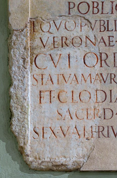 Veron[ae Tridenti Nic?]omediae / cui or[do Brix]i̲anor(um) / statuam a[urat(am) eq(uestrem) et fun]u̲s public(um) decr(evit) / et Clod[iae Q(uinti) fil(iae) P]rocillae / sacer[doti Divae Pl]otinae /