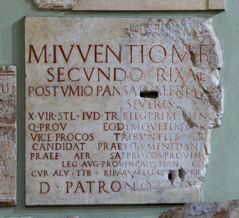 - [M(arco) Iuven]tio M(arci) f(ilio) / [Fab(ia) Secun]do Rixae / [Postumio(?) Pan]sae Valerian(o) / [---] Severo / [--- tri]b(uno) leg(ionis) Prim(ae) Min(erviae) / [--- eod]emque tempor(e) / [---t]ribun(o) pleb(is) pr(aetori) / [--- prae]f(ecto) frument(i) dand(i) / [---]t proco(n)s(uli) provinc(iae) / [--- leg(ato) Aug(usti) pr(o) pr(aetore) pro]vinc(iae) Aquitan(icae) co(n)s(uli)] / [cur(atori) alvei Tib(eris) et ripa]rum et clo[a]c(arum) urb[is] / [patro]no [d(ecreto)] d(ecurionum)