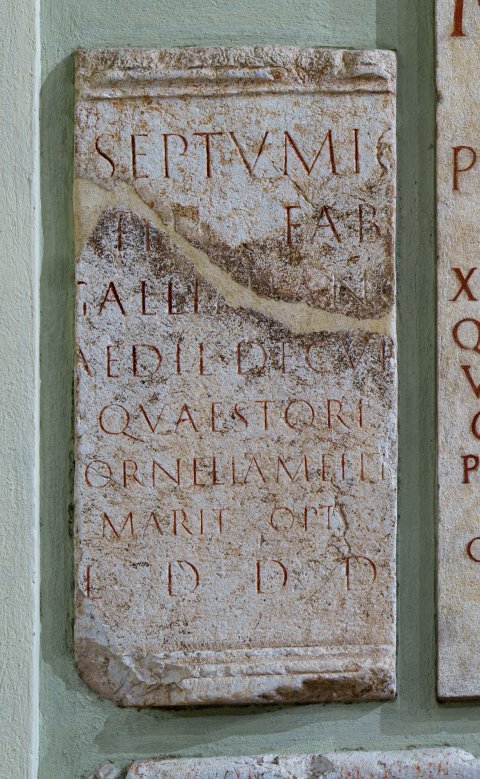 - [-] Septumio / L(uci) f(ilio) Fab(ia) / Galliniano / aedil(i) decur(ioni) / quaestori / [C]ornelia Melit[e] / marit(o) opt(imo) / l(ocus) d(atus) d(ecreto) d(ecurionum)