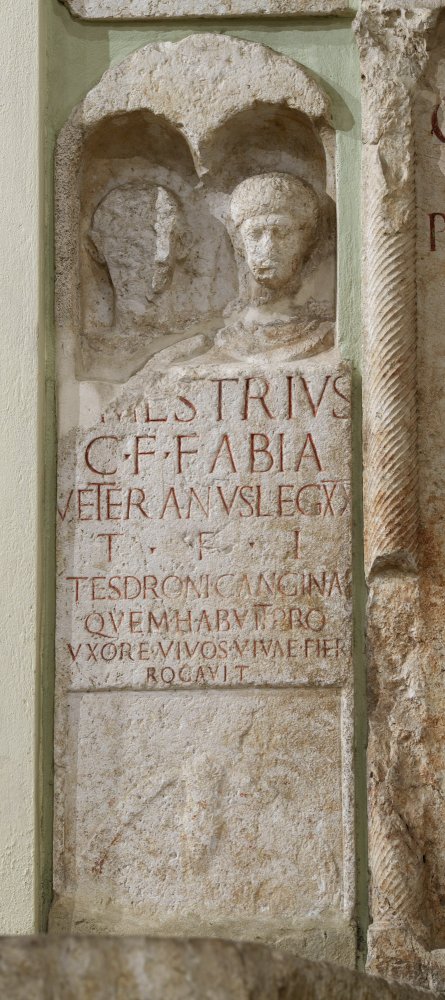 - C(aius) Mestrius / C(ai) f(ilius) Fabia / veteranus leg(ionis) XX / t(estamento) f(ieri) i(ussit) / et Esdroni Canginai / quem(!) habuit pro / uxore vivos(!) vivae fier[i] / rogavit