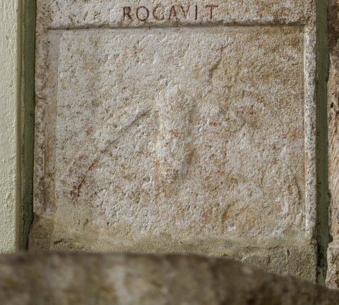 - Rundbogiger Abschluss, darunter zwei Bogennischen mit unbekleideten Büsten (Ehepaar, links Mann, rechts Frau mit Halsschmuck). Unterhalb der Inschrift gerahmtes Relieffeld (cingulum mit Dolch).