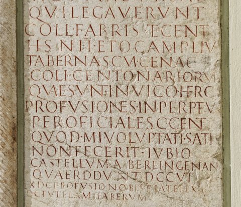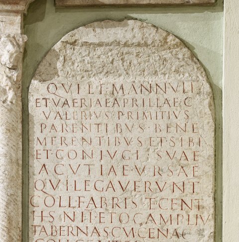 - [D(is) M(anibus)?] / [------] / qui et Mannuli / et Va(l)eriae Aprillae C(aius) / Valerius Primitius / parentibus bene / merentibus et sibi / et coniugi suae / Acutiae Ursae / qui legaverunt / coll(egiis) fabr(orum) et cent(onariorum) / HS n(ummum) II(milia) et (h)oc ampliu(s) / tabernas cum cenac(ulis) / coll(egio) centonariorum / quae sunt in vico Herc(ulio) / profusiones in perpetu(um) / per of(f)iciales c(ollegii) cent(onariorum) / quod mi(!) voluptati(!) sati(s) / non fecerit iub<e=I>o / castellum (h)abere(?) Ingenan(orum) / quae r(e)ddunt d(enarios) CC ut / ex d(enariis) C profusio nobis fiat et ex / d(enariis) C tutela{m} taber(nar)um s(upra) s(criptarum)