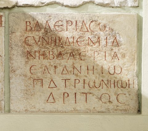 griechisch: Βαλερία Σω[φ̣ρο]/σύνη καὶ Ἐμιλ[ια]/νὴ Βαλερία / Ἐλιανὴ τ̣ῷ /