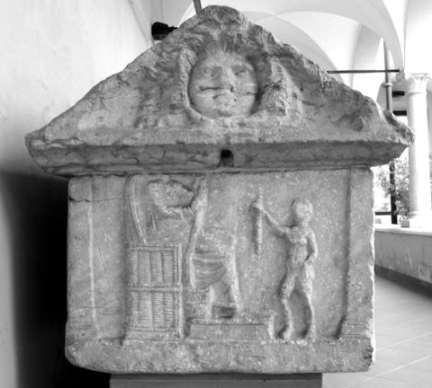 Dachförmiger Deckel mit Gorgoneion in den Giebelfeldern (zugehörig ?); auf der Kastenvorderseite gerahmtes Schriftfeld, seitlich davon von Säulen getragener Bogen, darunter stehender Trauergenius mit gesenkter Fackel.