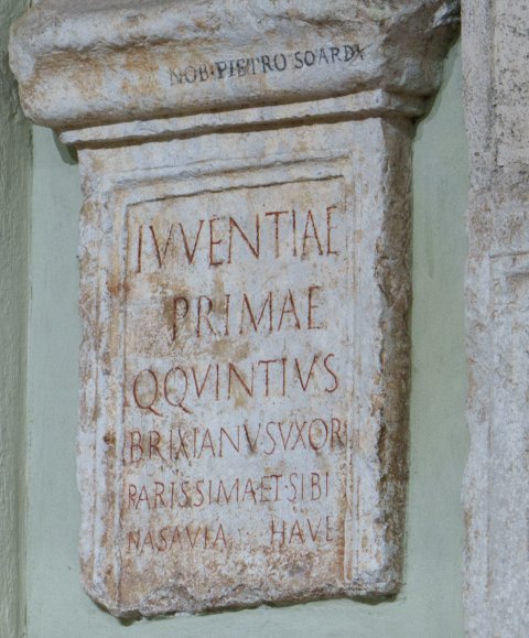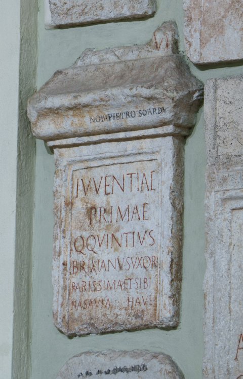 - [D(is)] M(anibus) // Iuventiae / Primae / Q(uintus) Quintius / Brixianus uxori / karissimae et sibi / Nasavia {h}ave