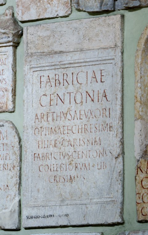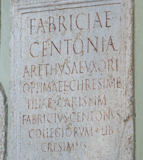 - Fabriciae / Centoniae / Arethusae uxori / optimae et Chresime / filiae carissim(ae) / Fabricius Centonius / collegiorum lib(ertus) / C(h)resimus