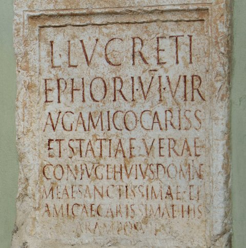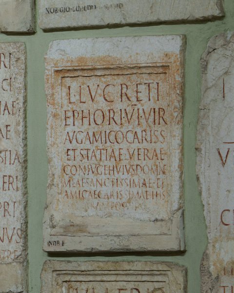 - L(uci) Lucreti / Ephori VIvir(i) / Aug(ustalis) amico cariss(imo) / et Statiae Verae / coniuge(!) huius domin(a)e / meae sanctissimae et / amicae carissimae his / aram posuit / [- I]uventius Eros amicis