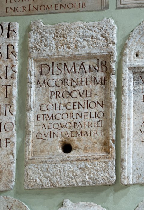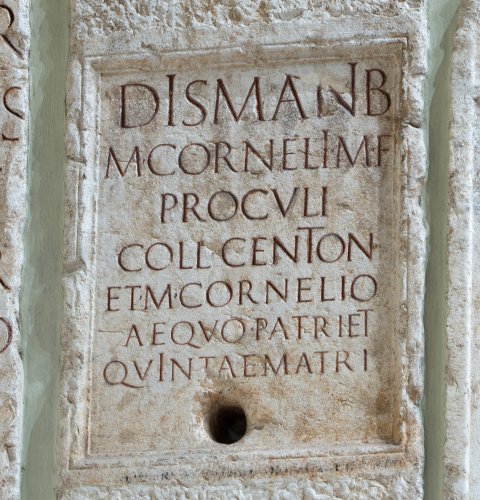 - Dis Manib(us) / M(arci) Corneli M(arci) f(ilii) / Proculi / coll(egium) centon(ariorum) / et M(arco) Cornelio / Aequo patri et / Quintae matri