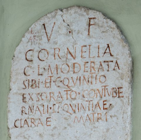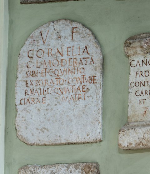 - V(iva) f(ecit) / Cornelia / C(ai) l(iberta) Moderata / sibi et Quintio / Exsorato contube/rnali et Quintiae / Clarae matri