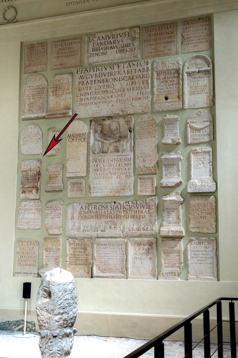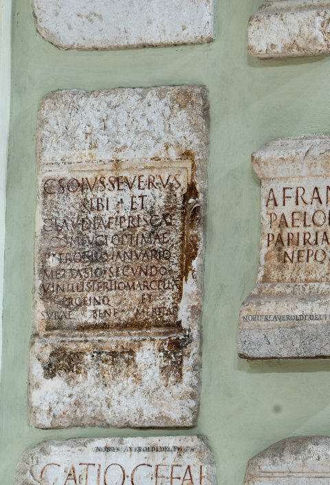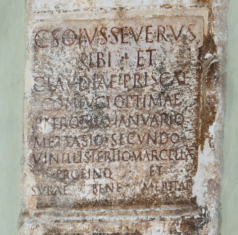- C(aius) Soius Severus / sibi et / Claudiae Priscae / coniugi optimae / Petronio Ianuario / Mettasio Secundo / Vinilli(i)s Tertio Marcellae / propinq(uis) et / Surae bene meritae