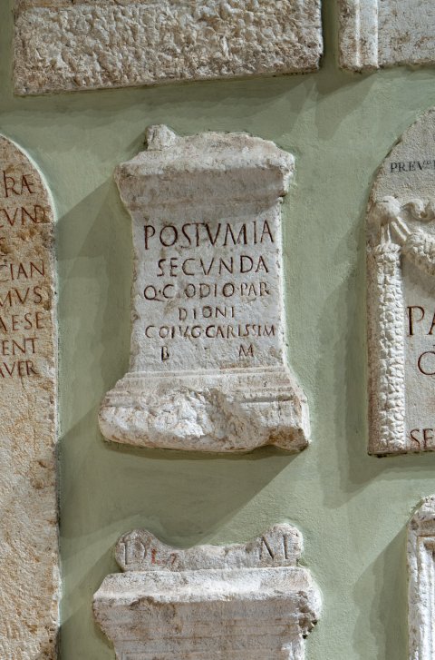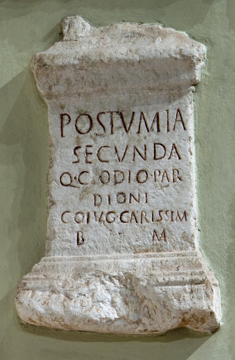 - Postumia / Secunda / Q(uinto) Clodio Par/dioni / co(n)iug(i) carissim(o) / b(ene) m(erenti)