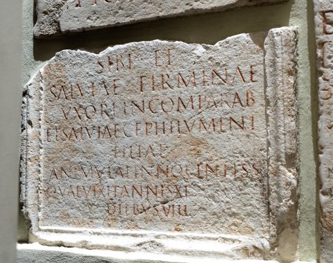 - ---] / [-]IC[---] / sibi et / Salviae Firminae / uxori incomparab(ili) / et Salviae C(ai) f(iliae) Philumene / filiae / animulae innocentiss(imae) / quae vixit annis XI / diebus VIII