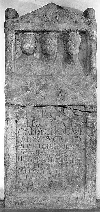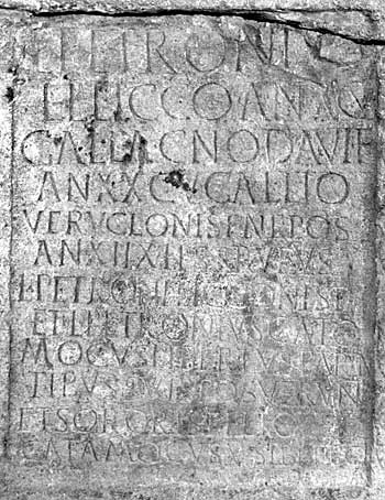 - L(ucius) Petroni[us] / L(uci) l(ibertus) Licco an(norum) XCV / Galla Cnodavi f(ilia) / an(norum) XXCV Gallio / Veruclonis f(ilius) nepos / an(norum) XIIX h(ic) s(iti) sunt) Rufus / L(uci) Petroni Licconis f(ilius) / et L(ucius) Petronius Cato/mocus libertus paren/tibus suis posuerunt / et sororis filio / Catamocus v(ivus) sibi fecit