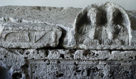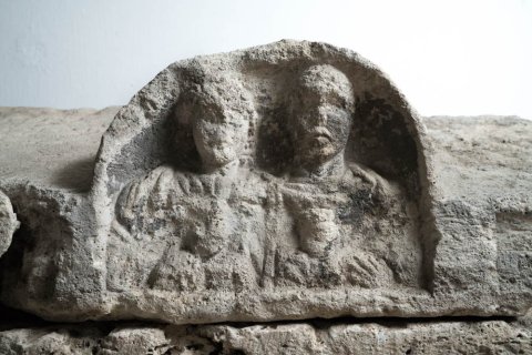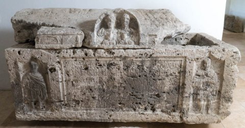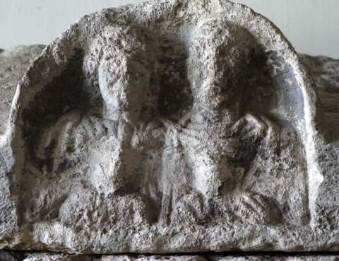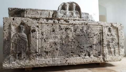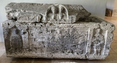 Deckel: In der Mitte der Vorderseite halbrundes Bildfeld mit Brustbildern einer Familie. Links Frau mit Scheitelzopf. Rechts Mann: bärtig, Sagum, Fibel. Vorn zwei Kinder. Am Deckelrand gerahmter Fries mit Werkzeugen (Säge, Winkel). Im Eckakroter Delphin.