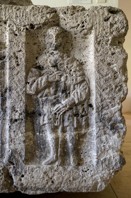 Auf der Vorderseite des Kastens Schriftfeld zwischen Nischen mit Giebel, darin jeweils stehender Soldat : bärtig, kurze Ärmeltunica, Gürtel mit Ringschnalle, Hosen, Sagum, Scheibenfibel. Der Mann links hält in der Rechten einen Maßstab (?), in der Linken ein Beil, der Mann rechts in der Linken einen Stab mit Knauf (Beneficiarierlanze ?). - Inschrift