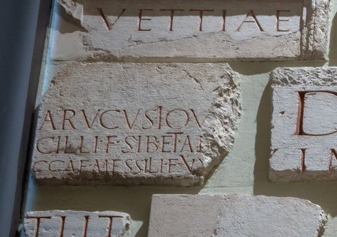 - Arugus Iovin/cilli f(ilius) sibi et Ad[lu]/ccae Messili f(iliae) ux[ori] / [t(estamento) f(ieri) i(ussit)]
