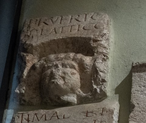 - unterhalb der Inschrift Rest einer Bogennische mit bartlosem Kopf