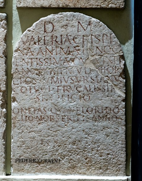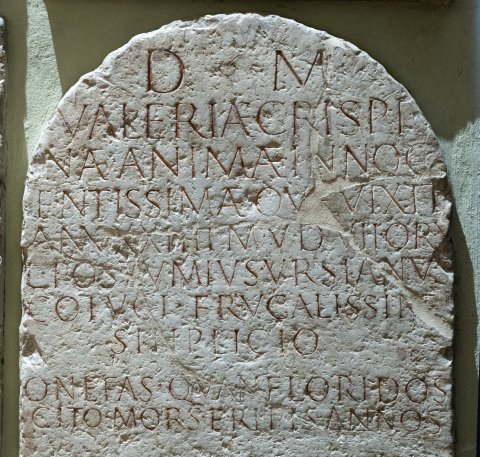 - D(is) M(anibus) / Valeriae Crispi/nae animae innoc/entissimae quae vixit / ann(os) XXIIII m(enses) V d(ies) VII (h)or(as) V / L(ucius) Postumius Ursianus / co(n)iugi frugalissimae / Sinplicio / o nefas quan floridos / cito mors eripis annos
