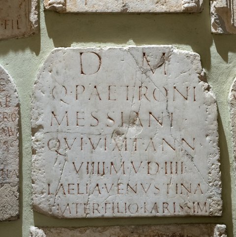 - D(is) M(anibus) / Q(uinti) Paetroni / Messiani / qui vixit ann(os) / VIIII m(enses) V d(ies) IIII / Laelia Venustina / mater filio karissim(o)