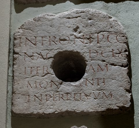 - In front(e) p(edes) CC / in agr(o) ped(es) CLX / iter [ad ar]am / mon[u]menti / in perpetuum