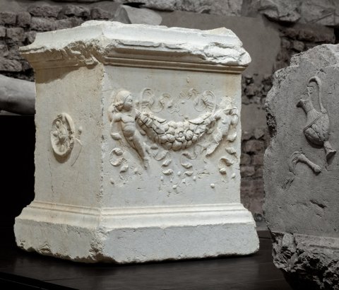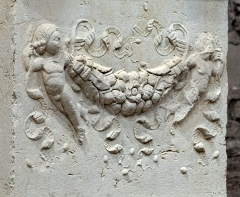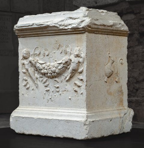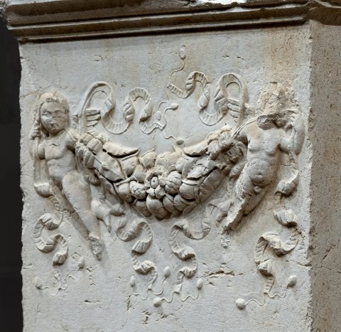 - Auf der Vorderseite Girlande, getragen von Eroten, auf den Nebenseiten Gefäße und Opfergeräte (links Patera und Opfermesser, rechts Kanne und Augurenstab).