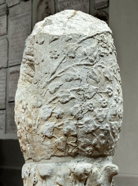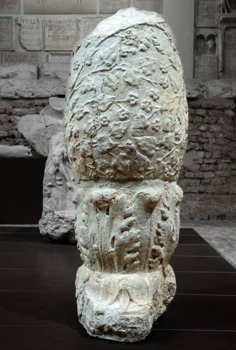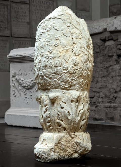 - Balusterförmige Bekrönung aus Akanthuskelch und Pinienzapfen, der von Efeuranken mit Blüten überzogen wird.