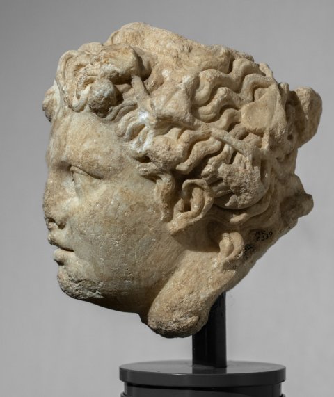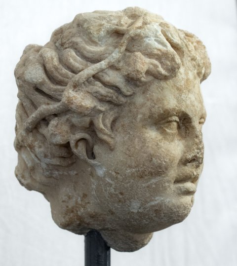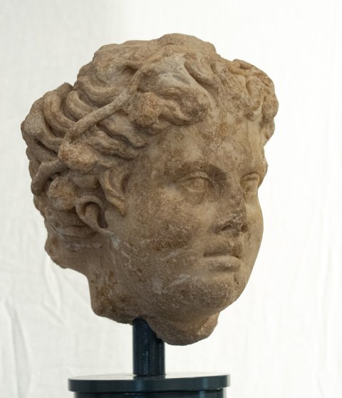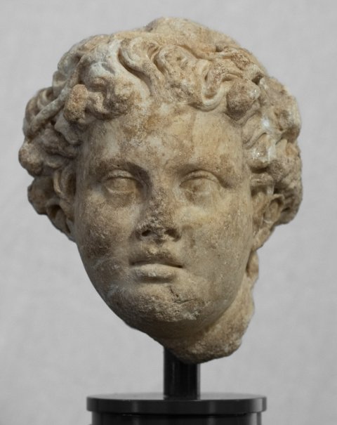 - Kopf eines Jünglings mit Efeuranke im stark gelockten Haar (mythische Figur ?, Dionysos ?)