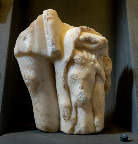 - Beinpartie einer stehenden, fast lebensgroßen Figur in kurzem Gewand, neben dem Bein Tierkopf (Stütze mit Tierfell ?).