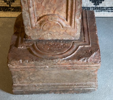- Hermenschaft mit gerahmter Inschrift, darunter leeres gerahmtes Feld; eingezapft in gesondert gearbeiteten Sockel mit Profilleisten. Oben halbrund ausgemeißelt, seitlich bogenförmige Vertiefungen.