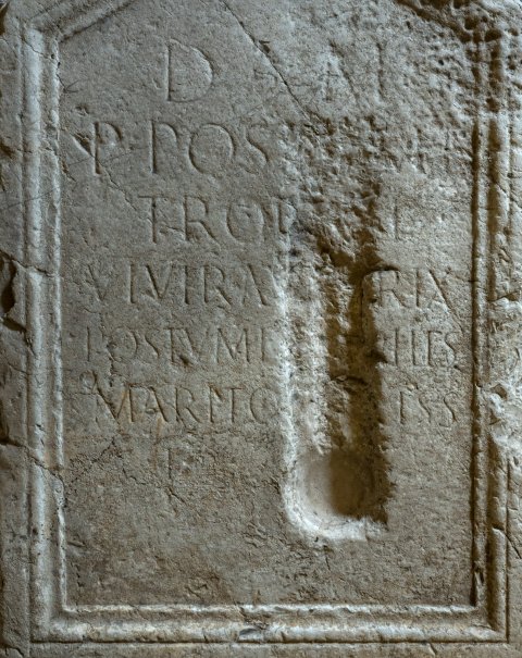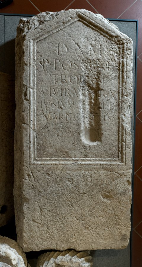 - D(is) M(anibus) / P(ubli) Post[umi] / Trop[him]i / VIvir(i) Au[g(ustalis) B]rix(iae) / Postumi[a Del]phis / marito [car]iss(mo)?