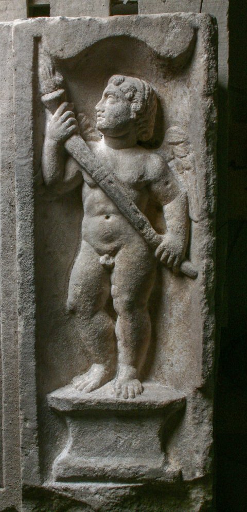 - Gerahmtes Schriftfeld zwischen Bogennischen. In der erhaltenen nackter geflügelter Knabe (Genius, Erot) mit erhobener Fackel auf Postament.