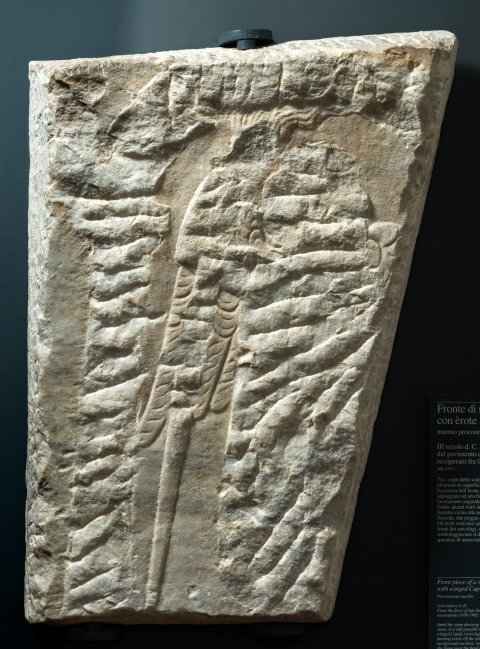 - Mythische Figur: Umrisse und rechter Flügel eines Trauergenius, der unter einem von Säuilen getragenen Bogen steht.