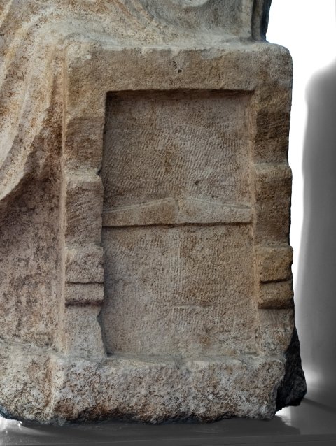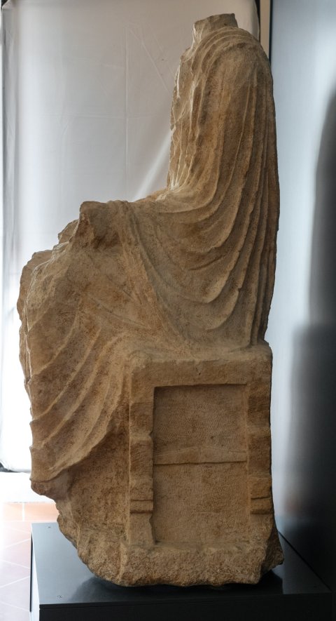 - auf einem lehnenlosen Stuhl sitzender Togatus, auf den Knien Diptychon (?)