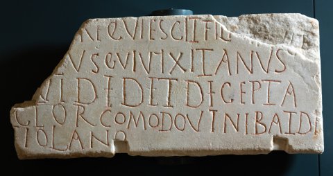 - [Hic] requiescit filius [---] / [---]cus qui vixit an(n)us(!) / XVI(?) dedet decepta / [---]ctor COMODOVINIBAIDI(?) / [---]tiolano