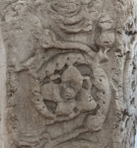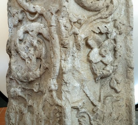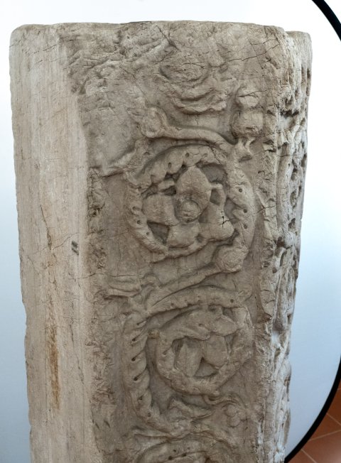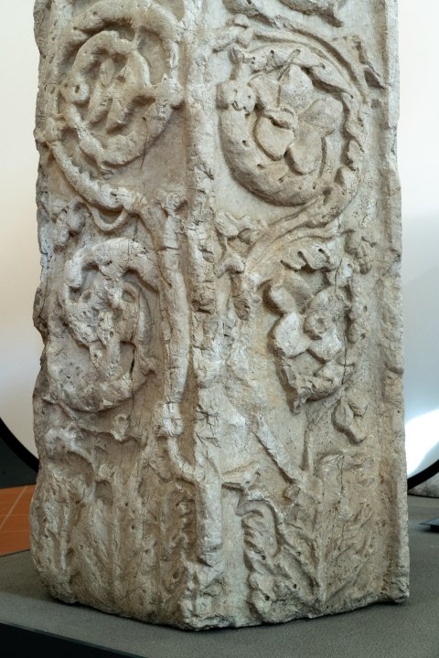 - Auf drei Seiten Akanthusranken mit Blüten, unten stehende Akanthusblätter; die anderen drei Seiten geglättet.