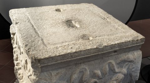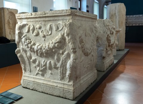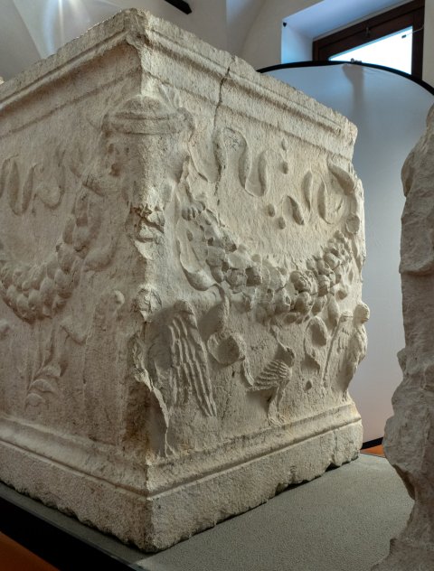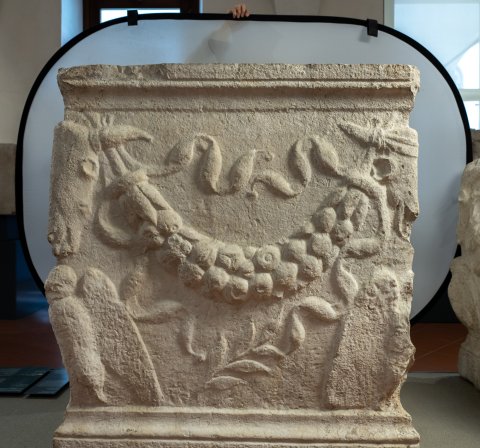 - Auf allen vier Seiten Fruchtgirlanden mit Tänien, aufgehängt an Bukranien, unter diesen stehende Adler mit ausgebreiteten Flügeln; unter den Girlanden auf zwei Seiten Zweige, auf einer ein Vogel (auf der vierten Seite ist dort das Relief zerstört).