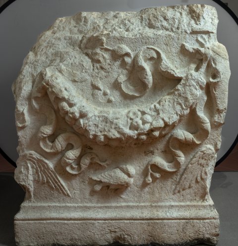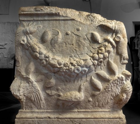- Auf allen Seiten Fruchtgirlanden mit Tänien, aufgehängt an Bukranien, unter diesen stehende Adler mit ausgebreiteten Flügeln; unter den Girlanden auf einer Seite Zweig, auf den rechts und links anschließenden Seiten je ein Vogel.