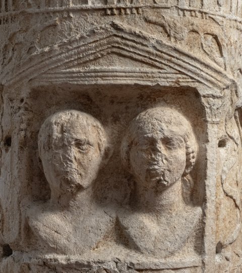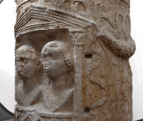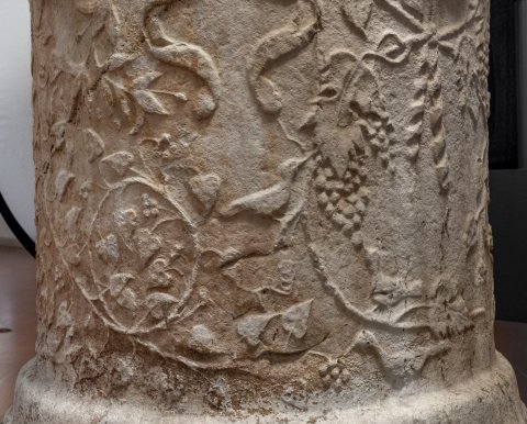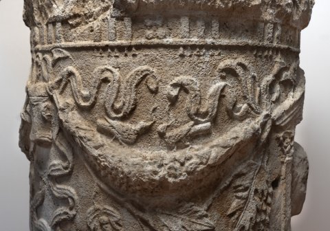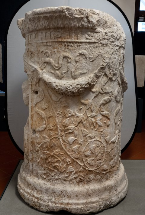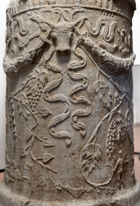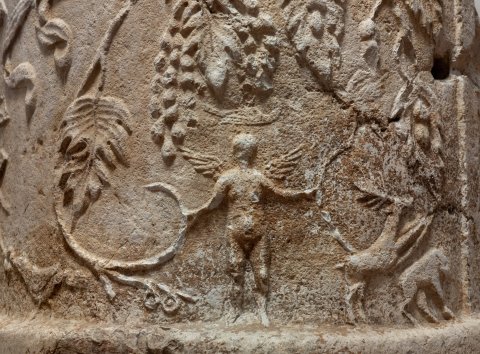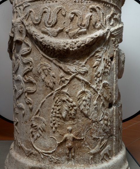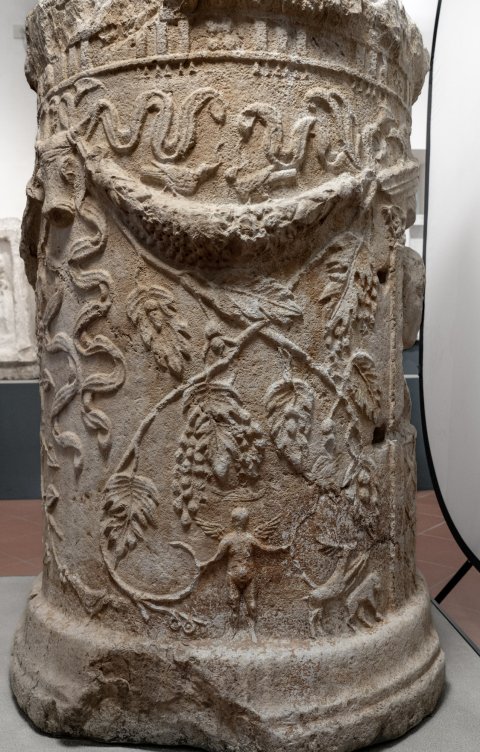 Um den Schaft an Bukranien hängende Girlanden mit Tänien, darunter Weinranken mit Vögeln, unten links von der Porträtädikula stehender Erot, zu seiner Linken Hirsch und weiteres Tier.