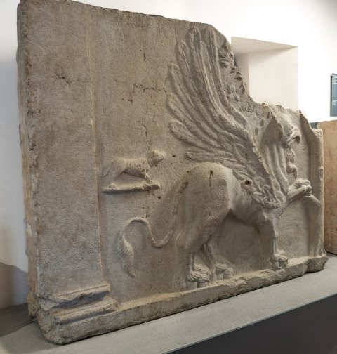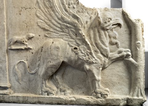 - Nach rechts gehender geflügelter Greif mit zu einem Baum erhobener linker Vorderpranke, hinter ihm kleiner Hund auf Standleiste, als Abschluss links glatter Pilaster. Teil einer Wandverkleidung ?