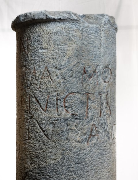 - DD(ominis) nn(ostris) / Magno Maximo et Fl(avio) / Victori Invictis / et perpetuis Aug(ustis) / b(ono) r(ei) p(ublicae) n(atis) / m(ilia) p(assuum) XX