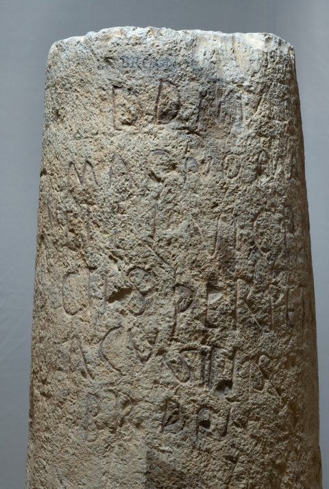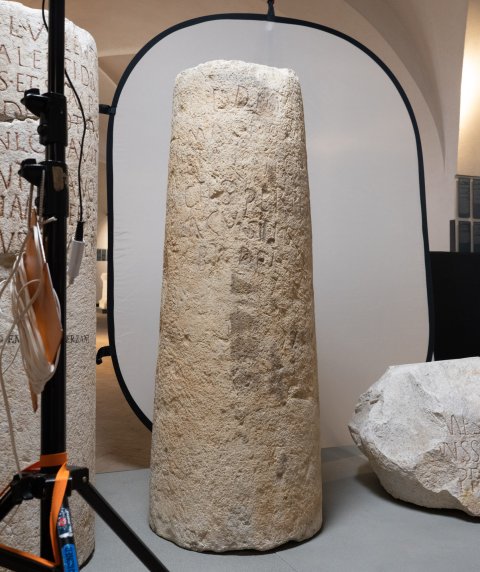 - DD(ominis) [nn(ostris) Fl(avio) Valentiniano] / et Fl(avio) / [Valenti] divinis fratribus / et se[mper] Augustis devota/{ta} Ven[etia] conlocavit // pe]rpetuis [ // DDD(ominis) [nnn(ostris) Valen]tiniano / Va[lenti et] Gratiano perpe/tui[s] Pii[s] Felicibus sem/per Augustis / XXXII // DD(ominis) nn(ostris) / Magno Max(imo) / et Fl(avio) Vic(to)ri Invi/ctis perpetuis / A(u)gustis / b(ono) r(ei) p(ublicae) n(atis)
