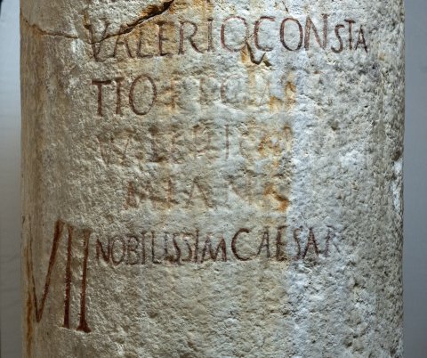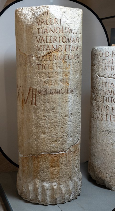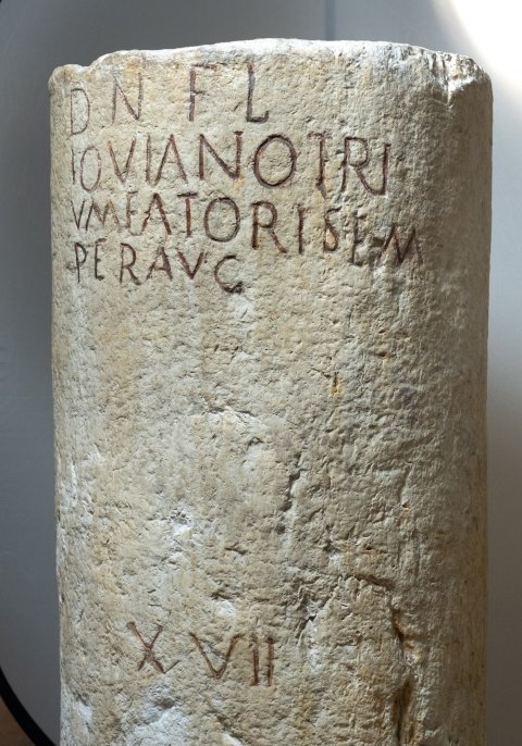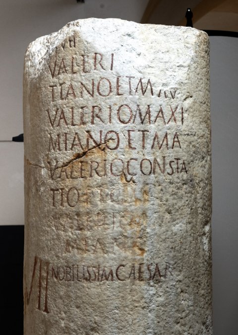 - [I]mp(eratoribus) [Caes(aribus) C(aio) Aur(elio)] / Valeri[o Diocle]/tiano et M(arco) Au[r(elio)] / Valerio Maxi/miano et M(arco) A[ur(elio)] / Valerio Cons[tan]/tio et Galerio / Valerio Maxi/miano / nobiliss(imis) Caesar(ibus) / XVII // D(omino) n(ostro) Fl(avio) / Ioviano tri/umfatori sem/per Aug(usto) / XVII