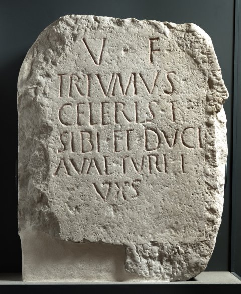 - V(ivus) f(ecit) / Triumus / Celeris f(ilius) / sibi et / Duci/avae Turi f(iliae) / ux{s}(ori)