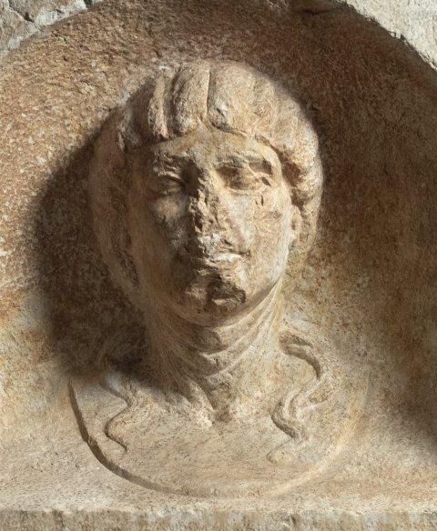- Über der rahmenlosen Inschrift Bogennische mit unbekleideter Büste einer Frau mit Schulterlocken.