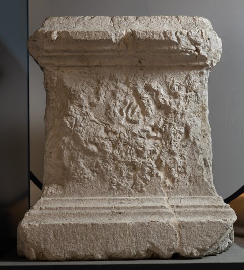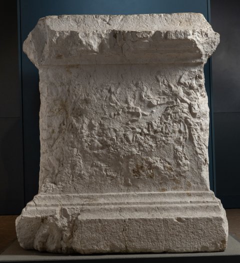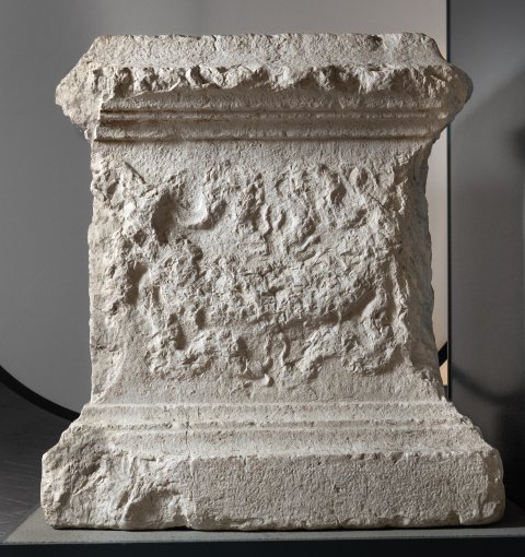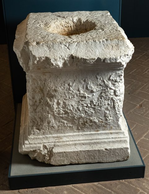 - Reliefs stark bestoßen u. verrieben, Deck- u. Sockelprofil verbr., in der Oberseite runde Aushöhlung