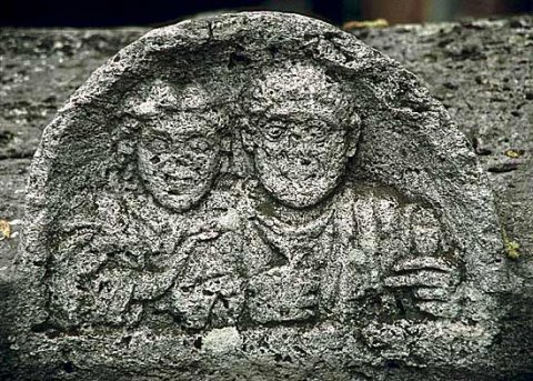 Dachförmiger Deckel, Eckakrotere mit Masken, in der Mitte des Randes halbrundes Bildfeld mit zwei Brustbildern (Ehepaar). Links Frau: Mittelscheitel, gewelltes Haar. Rechts Mann: bärtig, Sagum, Scheibenfibel.