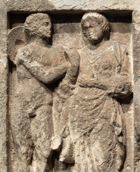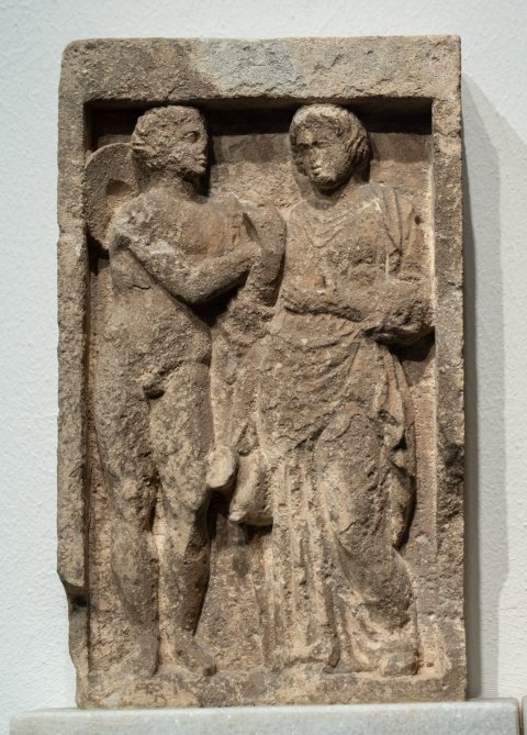 Mythos: Elektra mit Schale in der rechten Hand, an ihre rechte Seite angelehnt Orest mit Reisehut.
